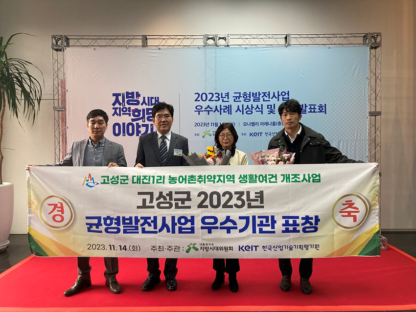(강원=NSP통신) 조이호 기자 = 강원특별자치도 고성군(군수 함명준) ‘대진1리 농어촌 취약지역 생활여건 개조사업’이 14일 대통령 직속 지방시대위원회가 주최한 2023년 균형 발전사업 우수사례 시상식 및 성과발표회에서 균형 발전사업 자율계정 우수사례로 선정돼 기관표창을 수상했다.