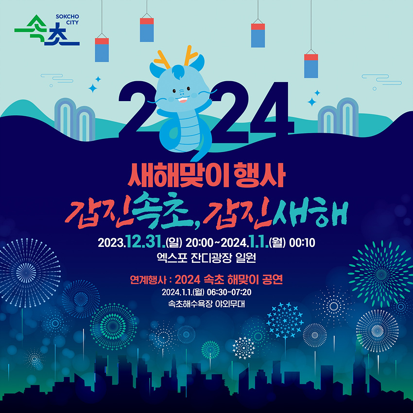 (강원=NSP통신) 조이호 기자 = 강원특별자치도 속초시(시장 이병선)가 갑진년 ‘푸른 청용의 해’를 맞아 오는 31일 오후 8시부터 엑스포 잔디광장에서 2024년 속초 새해맞이 행사 ‘갑진속초, 갑진새해’를 개최하고 1월 1일 새해 오전 6시 30분부터 속초해수욕장 야외무대 일원에서 해맞이 공연을 연계 행사로 진행한다.