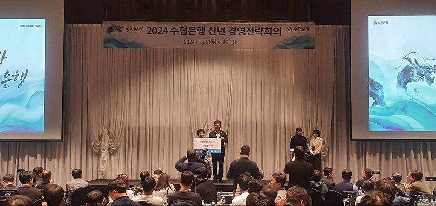 행사는 2024년 수협은행 신년 경영전략회의 개최로 Sh수협은행장을 비롯한 수협은행 임원, 본부장, 영업점 직원 등 220여 명이 참석한 가운데 강릉시 고향사랑기부금 전달식이 이뤄졌다.