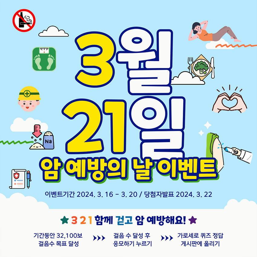 암 예방의 날을 상징하는 3만2100보 걷기 달성 후 가로세로 퀴즈 정답을 게시판에 올리면 추첨을 통해 당첨된 200명에게 상품을 지급하는 방식으로 진행된다.