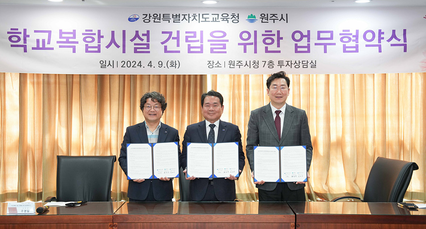 (강원=NSP통신) 조이호 기자 = 강원특별자치도교육청(교육감 신경호)은 9일 원주시(시장 원강수) 및 원주교육지원청(교육장 주영일)과 ‘(가칭)원주꿈이룸커뮤니티센터 학교복합시설 공모사업 추진을 위한 업무협약식’을 원주시청에서 개최했다.
