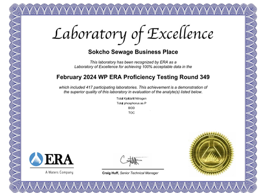 평가에서 하수처리사업소는 수질 분야 4개 항목(BOD, TOC, T-N, T-P)에서 모두 ‘적합’ 판정을 받아 우수분석기관(Labotatory of Excellence)으로 국제적으로 인정받았다.
