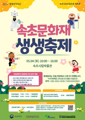 (강원=NSP통신) 조이호 기자 = 강원 속초시(시장 이병선)가 오는 4일 오전 10시부터 오후 4시까지 속초시립박물관 일원에서 ‘속초문화재 생생축제’를 개최한다.