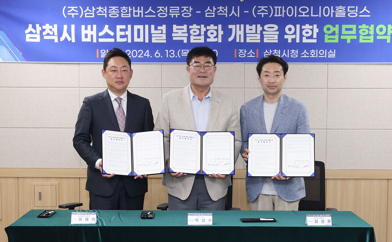 (강원=NSP통신) 조이호 기자 = 강원 삼척시(시장 박상수)가 13일 삼척종합버스정류장(대표 홍영숙), 파이오니아홀딩스(대표 김상윤)와 삼척버스터미널 복합화개발을 위한 업무협약을 체결하고 실무협의체 구성에 나섰다.