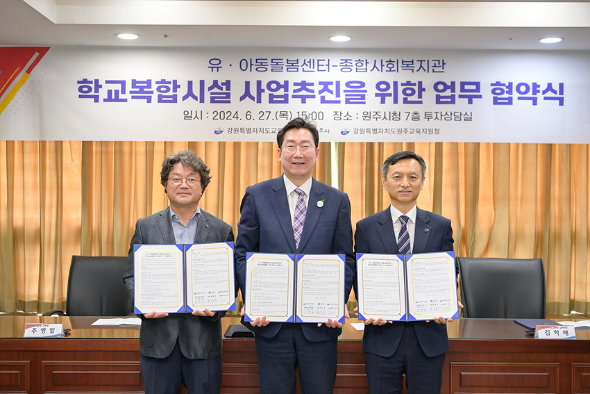 (강원=NSP통신) 조이호 기자 = 강원 원주시(시장 원강수)가 27일 시청 투자상담실에서 강원특별자치도교육청(교육감 신경호), 원주교육지원청(교육장 주영일)과 학교복합시설 ‘원주 서북권 유·아동돌봄시설 및 종합사회복지관’ 건립 추진을 위한 업무 협약을 체결했다.
