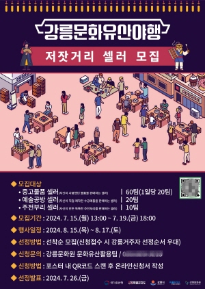 (강원=NSP통신) 조이호 기자 = 강원 강릉시(시장 김홍규) 강릉문화원(원장 김화묵)이 8월 15일부터 17일까지 개최되는 ‘2024 강릉문화유산야행’에서 저잣거리 셀러를 모집한다.