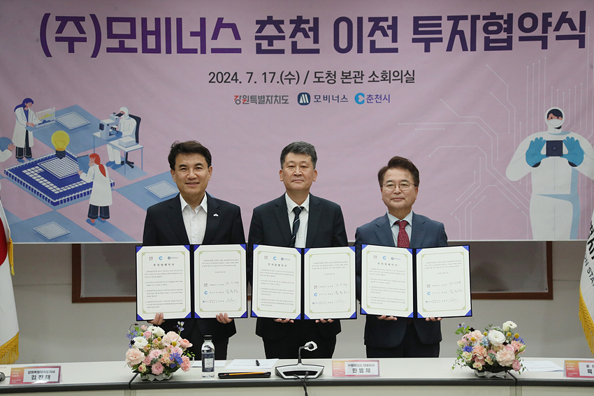 (강원=NSP통신) 조이호 기자 = 강원특별자치도(지사 김진태)가 17일 도청 본관 소회의실에서 춘천시, 모비너스와 함께 투자협약식을 체결했다.
