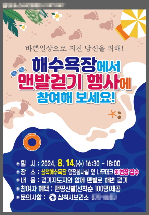 행사는 해변 모래사장 맨발 걷기 체험을 통해 시민의 건강 증진 및 걷기 실천율을 제고하기 위해 마련됐으며 삼척해수욕장 일원 2km 구간을 왕복할 계획이다.