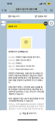 (강원=NSP통신) 조이호 기자 = 강원 강릉시(시장 김홍규)가 하반기 체납차량 번호판 상시 영치 시행 전 카카오톡 영치예고 안내문(8904건/15억2600만원)을 통해 자동차세 체납자에게 자진납부를 안내하고 있다.