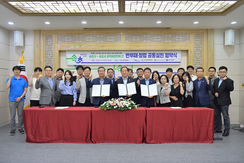 (강원=NSP통신) 조이호 기자 = 강원 속초시(시장 이병선)가 27일 시청 상황실에서 관내 공직유관단체(속초시 시설관리공단, 속초문화관광재단, 속초시체육회)와 반부패·청렴 공동실천 협약식을 개최했다.