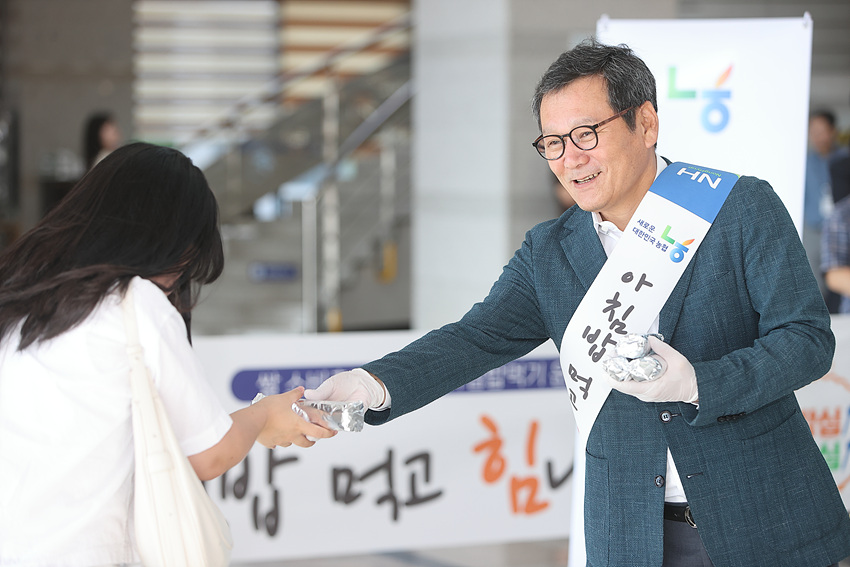 이날 행사에는 김홍규 시장을 비롯한 농협중앙회강릉시지부·강릉시 관내 농축협 임직원들이 참석한 가운데 ‘우리쌀, 건강한 아침밥’이라는 주제로 아침밥 먹기 상생협력을 위한 업무 협약식을 진행하고 시청 직원들을 대상으로 강릉쌀로 만든 김밥 나눠주기 행사를 가졌다.