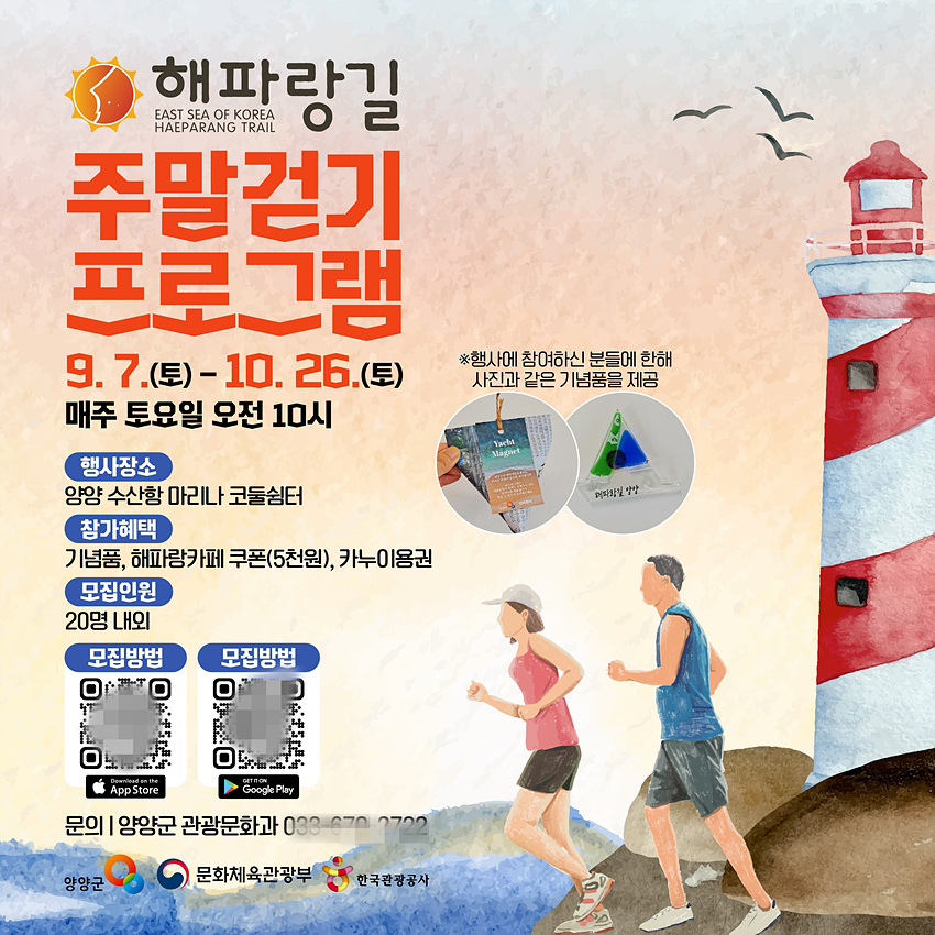 (강원=NSP통신) 조이호 기자 = 강원 양양군(군수 김진하)이 7일부터 10월 26일 중 매주 토요일에 해파랑길 길동무 프로그램을 진행하고 매회 참여자 20명을 선착순으로 모집한다.