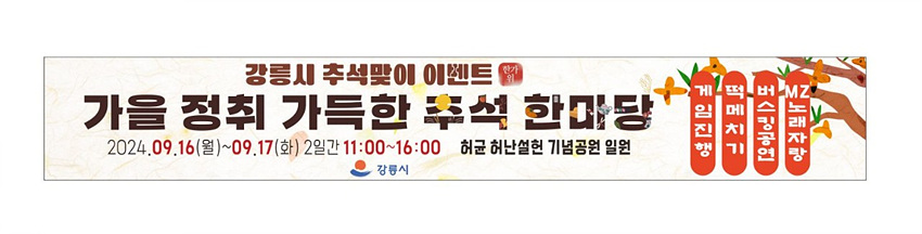 (강원=NSP통신) 조이호 기자 = 강원 강릉시(시장 김홍규)가 추석 명절을 맞이해 오는 16~17일 오전 11시부터 오후 4시까지 허균·허난설헌 기념공원에서 ‘가을정취 가득한 추석한마당’ 문화행사를 개최한다.