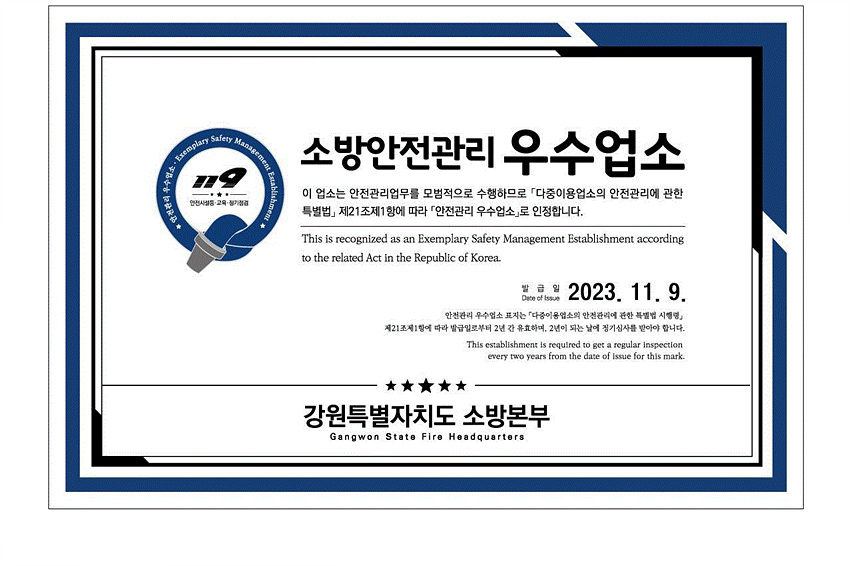 (강원=NSP통신) 조이호 기자 = 강원특별자치도 소방본부가 2024년 안전관리 우수 다중이용업소 선정에 앞서 사전 예정 대상처 8개소를 12일 강원도보에 공고했다.