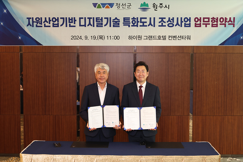 (강원=NSP통신) 조이호 기자 = 강원 원주시(시장 원강수)가 19일 정선 하이원리조트에서 정선군(군수 최승준)과 자원산업 디지털 전환도시 클러스터 구축을 위한 업무협약식을 개최했다.