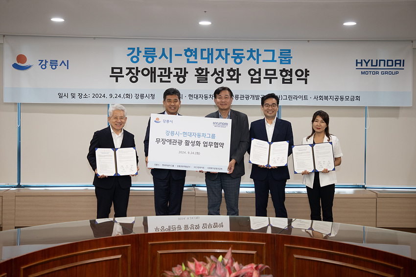 (강원=NSP통신) 조이호 기자 = 강원 강릉시(시장 김홍규)가 무장애관광 활성화를 위해 24일 시청 8층 시민사랑방에서 현대자동차그룹, 강릉관광개발공사, 그린라이트, 사회복지공동모금회와 ‘휠셰어 연계 운영 협약’을 체결했다.