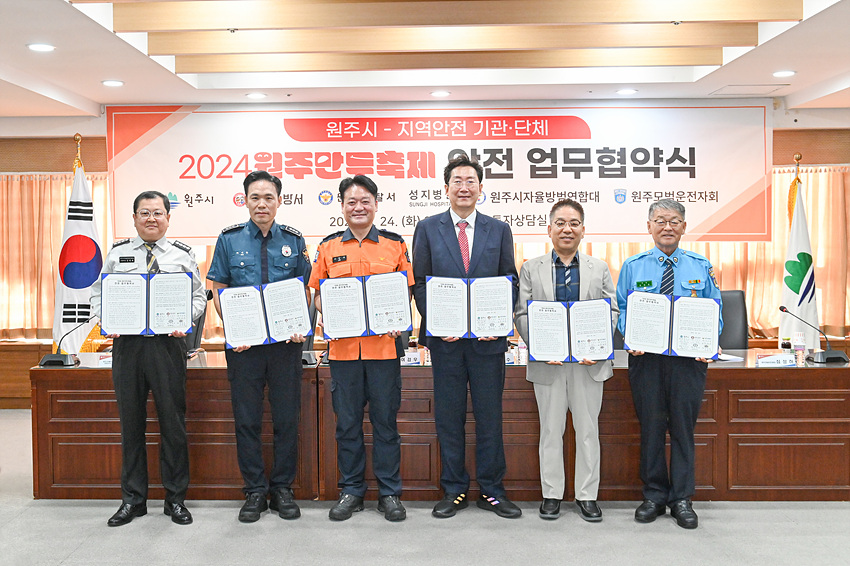 (강원=NSP통신) 조이호 기자 = 강원 원주시(시장 원강수)가 24일 시청 7층 투자상담실에서 지역 안전 관련 5개 기관·단체와 ‘2024 원주만두축제 안전 업무협약’을 체결했다.