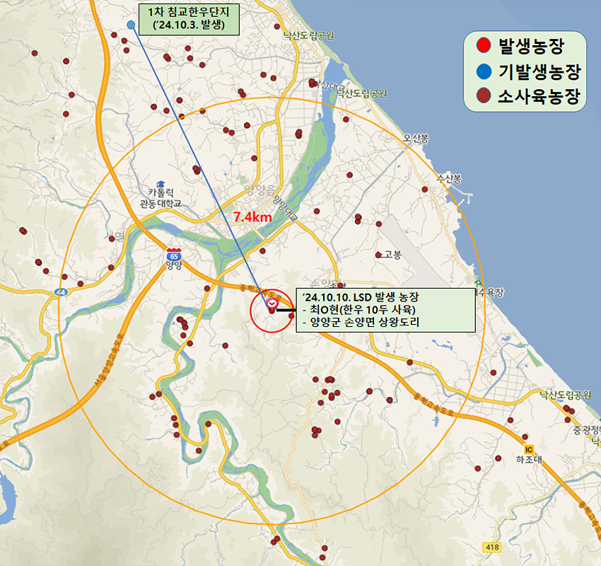이와 관련해 도는 발생농장에 가축위생방역지원본부 초동방역팀을 긴급 투입해 현장 통제 및 소독을 실시 중이며, 양양군 및 인접 5개 시군(강릉, 속초, 홍천, 평창, 인제)에 일시 이동 중지 명령을 발령해 축산 관련 종사자 및 차량에 의한 전파 위험을 차단하고 있다.