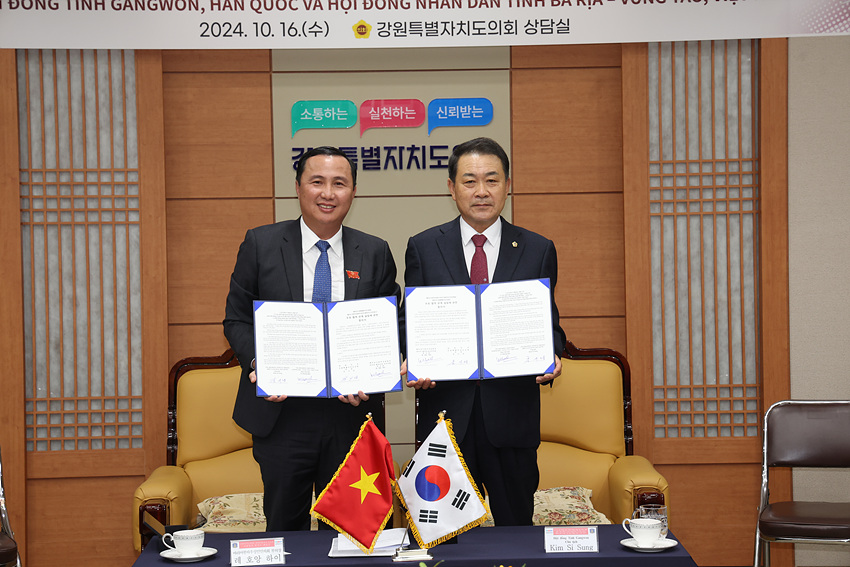 (강원=NSP통신) 조이호 기자 = 강원특별자치도의회(의장 김시성)가 16일 도의회에서 베트남 바리아-붕따우성 인민의회와 우호협력 관계 설립에 관한 합의서를 체결했다.