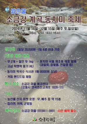 (강원=NSP통신) 조이호 기자 = 강원 강릉시(시장 김홍규) 연곡면 소금강마을에서 오는 16일부터 12월 15일까지 매주 토, 일요일마다 ‘맑은물 소금강 계곡 동치미 축제’가 열린다.