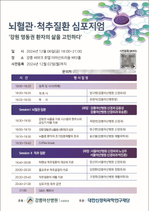 (강원=NSP통신) 조이호 기자 = 강원 강릉아산병원(병원장 유창식)이 12월 6일 오후 6시 강릉 씨마크호텔 바다홀에서 ‘뇌혈관·척추질환 심포지엄’을 개최한다.