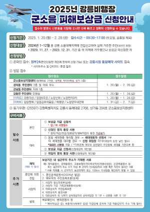 (강원=NSP통신) 조이호 기자 = 강원 강릉시(시장 김홍규)가 올해 군소음 보상 지역인 성덕동 등 5개 면·동에 거주하는 4만4000여 명 대상으로 오는 20일부터 2월 28일까지 군소음 피해보상금 신청을 받는다.