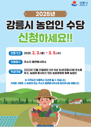 (강원=NSP통신) 조이호 기자 = 강원 강릉시(시장 김홍규)가 농업인 수당 지원사업 신청을 거주지 읍면동을 통해 3일부터 오는 3월 5일까지 접수받는다.