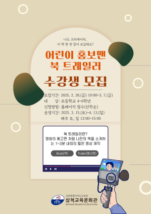 (강원=NSP통신) 조이호 기자 = 강원 삼척교육문화관(관장 김범중)이 관내 초등학교 4~6학년 15명을 대상으로 3월 15일부터 ‘어린이 홍보맨 북 트레일러’ 프로그램을 운영한다.