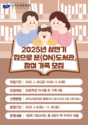 (강원=NSP통신) 조이호 기자 = 강원 삼척교육문화관(관장 김범중)이 초등학생 자녀를 둔 가족을 대상으로 책 꾸러미 드림 ‘집으로 온(ON) 도서관’을 운영한다.