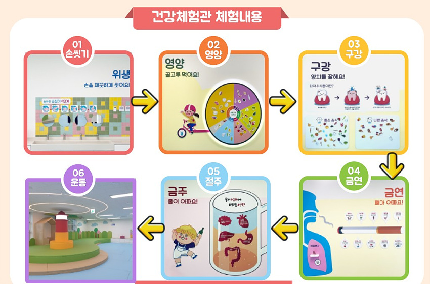 건강체험관은 4~6세 어린이들이 건강한 생활 습관 형성을 위해 ▲위생 ▲영양 ▲구강 ▲금연 ▲금주 ▲신체활동 등 테마별로 올바른 건강지식을 배우고 체험할 수 있는 공간이다.