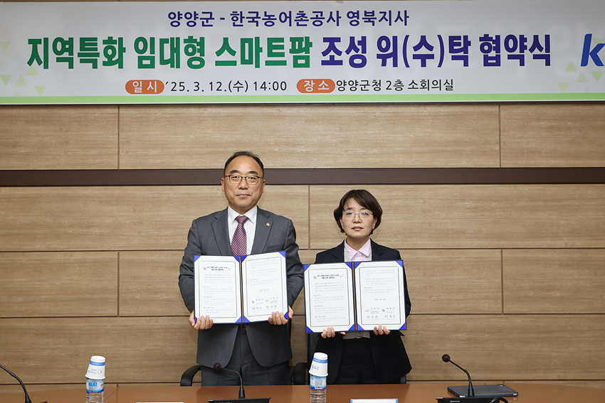(강원=NSP통신) 조이호 기자 = 강원 양양군이 12일 군청 소회의실에서 한국농어촌공사 영북지사와 함께 ‘양양 지역특화 임대형 스마트팜 조성사업’ 추진을 위한 위·수탁 협약을 체결했다.