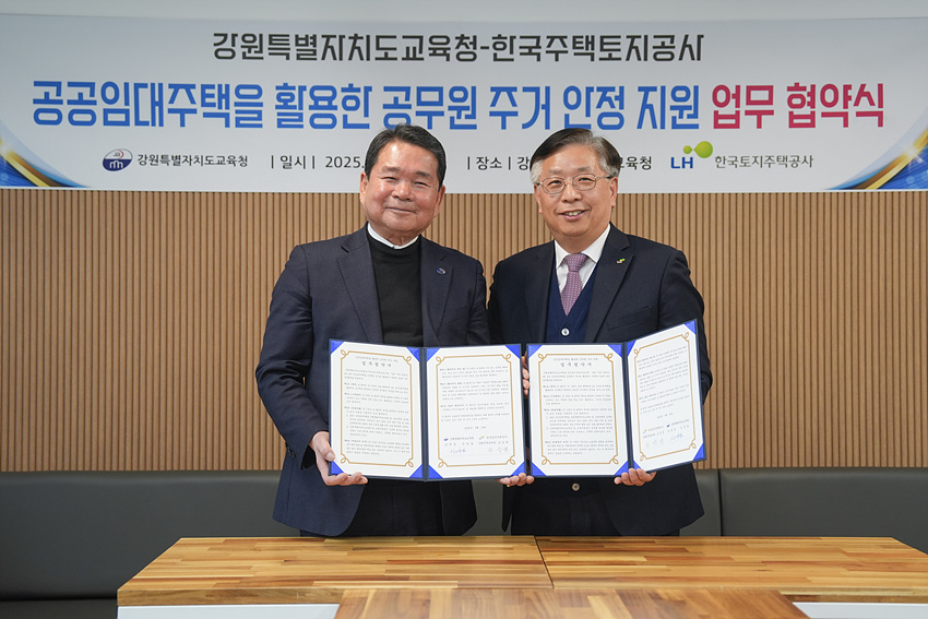 (강원=NSP통신) 조이호 기자 = 강원특별자치도교육청(교육감 신경호)은 18일 도교육청에서 한국토지주택공사 강원지역본부(본부장 오승찬)와 공공임대주택을 활용해 도내 순환 근무하는 공무원 주거 안정을 지원하는 업무협약을 체결했다.
