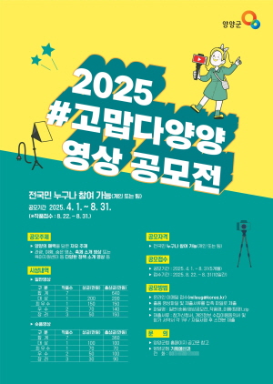(강원=NSP통신) 조이호 기자 = 강원 양양군(부군수 탁동수)이 1일부터 8월 31일까지 ‘2025 고맙다양양 영상 공모전’을 개최한다.