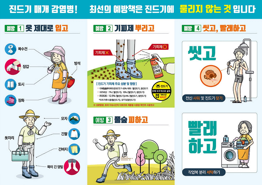 또한 야외활동 후 착용했던 옷은 즉시 세탁하고 샤워를 하면서 몸에 진드기가 붙어 있는지 확인하는 등 예방수칙을 준수해야 한다.