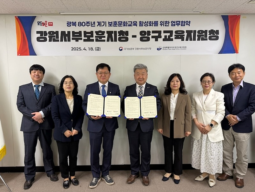 (강원=NSP통신) 조이호 기자 = 강원 양구교육지원청(교육장 임남호)은 18일 강원서부보훈지청에서 광복 80주년을 맞이해 보훈문화 교육 활성화를 위한 강원서부보훈지청(지청장 정백규)과 업무협약을 체결했다.