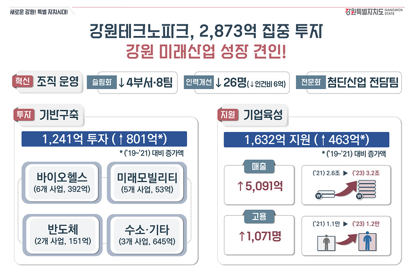 (강원=NSP통신) 조이호 기자 = 강원특별자치도(도지사 김진태) 강원테크노파크(이사장 김진태, 원장 허장현)가 과감한 혁신과 함께 총 2873억원 규모의 투자를 추진해 강원의 미래산업 성장을 견인하고 있다.