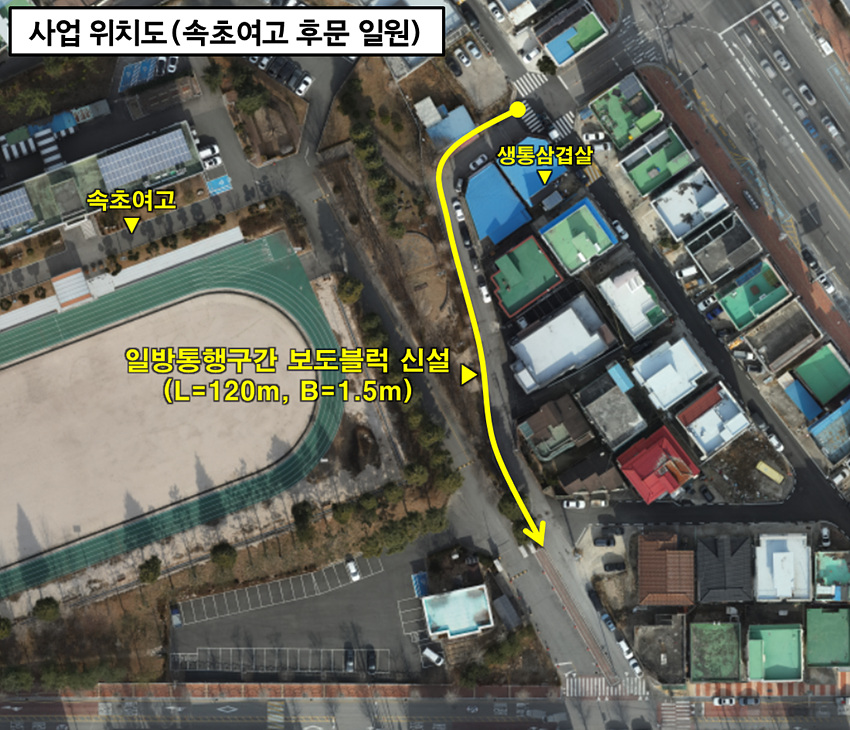 새롭게 지정한 일방통행 구간은 속초여고 후문에서 정문까지 약 100m 구간이다. 시에서는 일방통행 지정으로 확보된 도로 공간을 활용해 1.5m 폭의 보도를 신설해 학생을 비롯한 보행자들의 통행 안전을 강화할 계획이다.