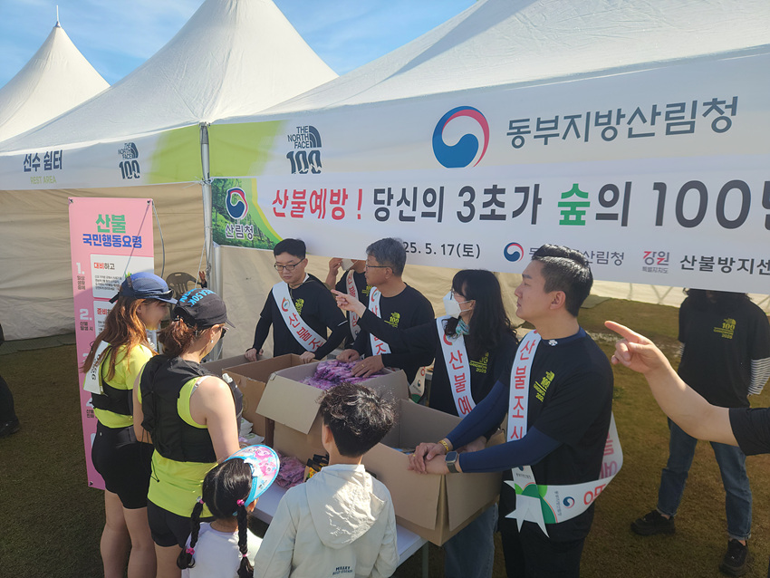 (강원=NSP통신) 조이호 기자 = 강원 동부지방산림청(청장 최수천)은 17일 강릉에서 개최된 국제 울트라트레일러닝대회(TNF100)에 산불조심을 위한 국민 의식 제고를 위해 강원특별자치도 산불방지센터와 함께 ‘산불예방 유관기관 합동캠페인’을 추진했다.