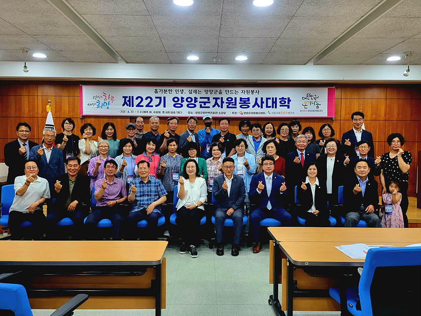 (강원=NSP통신) 조이호 기자 = 강원 양양군(부군수 탁동수) 양양군자원봉사센터(센터장 최윤선)가 17일 양양군문화복지회관 2층 소강당에서 2025년 ‘제22기 양양군자원봉사대학’ 개강식을 개최했다.