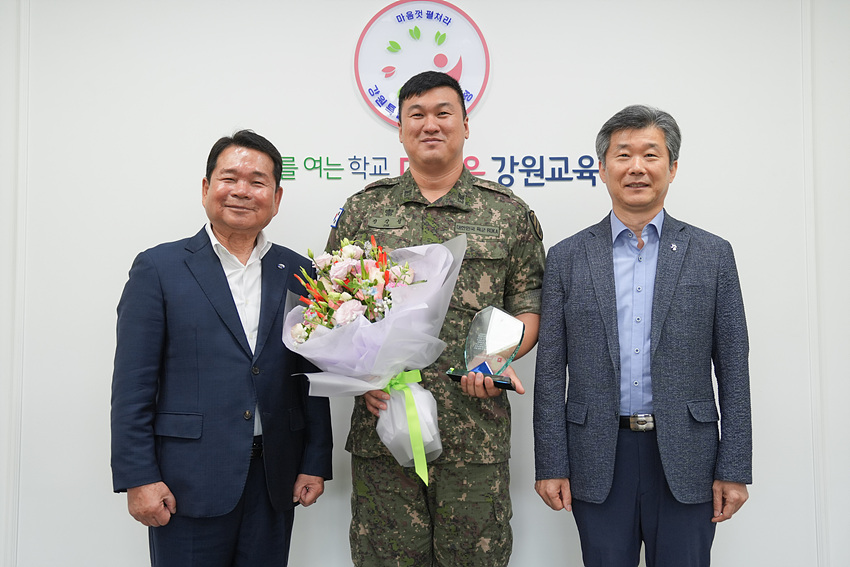(강원=NSP통신) 조이호 기자 = 강원특별자치도교육청(교육감 신경호)은 30일 교육감실에서 홍천강 물놀이 사고 당시 위험을 무릅쓰고 학생 2명을 구조한 육군 11기동사단 진강섭 상사에게 감사패를 전달했다.