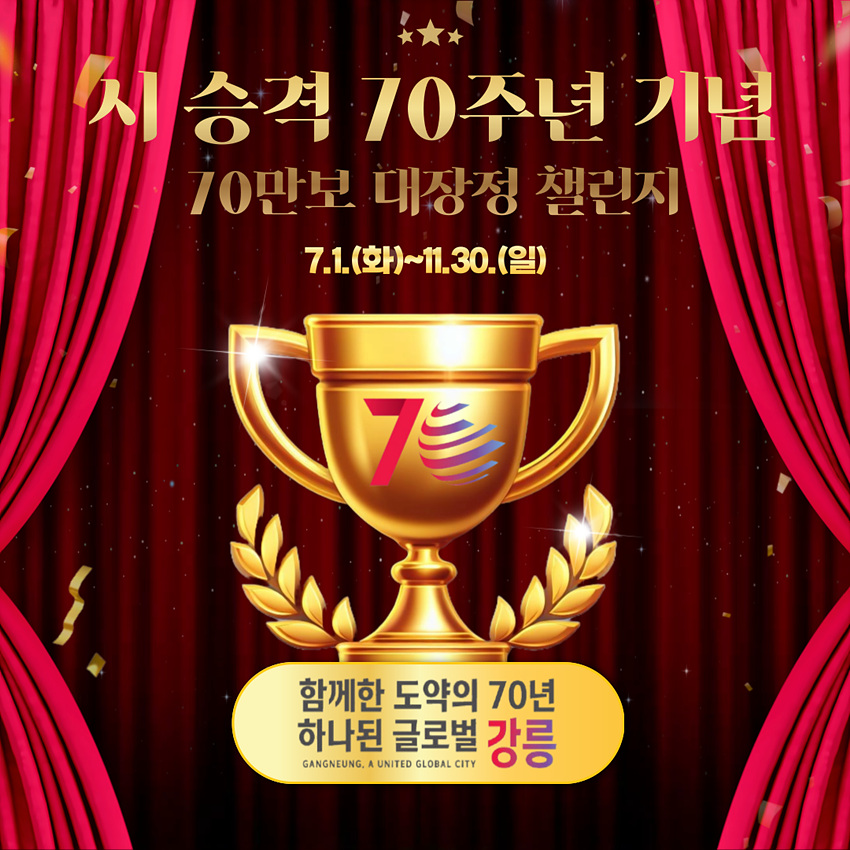 (강원=NSP통신) 조이호 기자 = 강원 강릉시(시장 김홍규)가 시 승격 70주년을 기념해 시민 건강증진과 걷기 실천 문화 확산을 위한 ‘70만 보 걷기 챌린지’를 1일부터 오는 11월 30일까지 5개월간 진행한다.