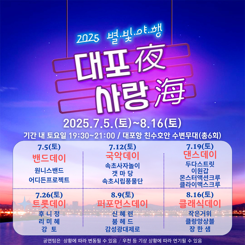 (강원=NSP통신) 조이호 기자 = 강원 속초시(시장 이병선)가 여름밤의 낭만과 설렘을 담은 특별한 야외공연 ‘2025 대포夜 사랑海(대포야 사랑해)’ 콘서트를 오는 5일부터 8월 16일까지 매주 토요일 오후 7시 30분 대포항 친수호안 수변무대에서 선보인다.