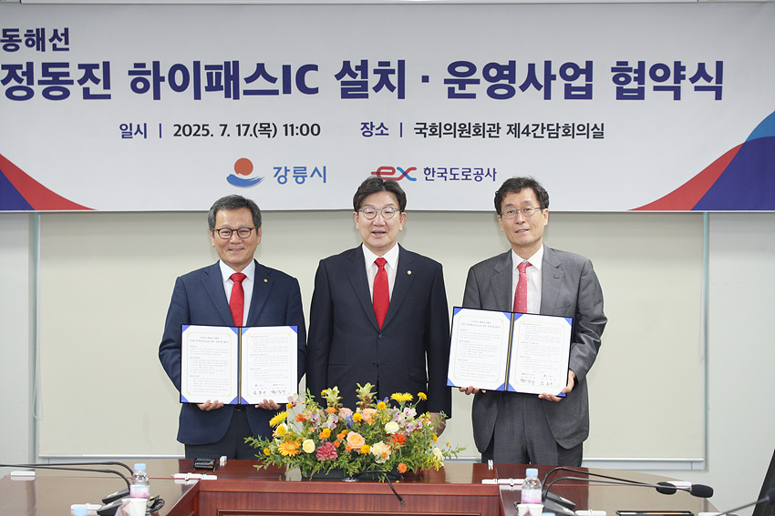 (강원=NSP통신) 조이호 기자 = 강원 강릉시(시장 김홍규)와 한국도로공사(사장 함진규)가 17일 국회 의원회관에서 동해고속도로 ‘정동진 하이패스IC 설치(가칭)’를 위한 업무협약을 체결했다.