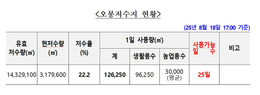 특히 오봉저수지 저수율은 22.2%까지 떨어져 평년치(33%)에도 크게 못 미치고 있으며 현 수준으로는 약 25일분만 공급이 가능하다. 시는 이미 재난기금과 예비비를 활용해 생수 확보에 나섰고 고지대·영세 자영업 현장에는 우선적으로 지원할 계획이다.