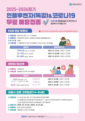 (강원=NSP통신) 조이호 기자 = 강원 강릉시(시장 김홍규)가 2025-2026절기 독감 및 코로나19 무료 예방접종을 실시한다.