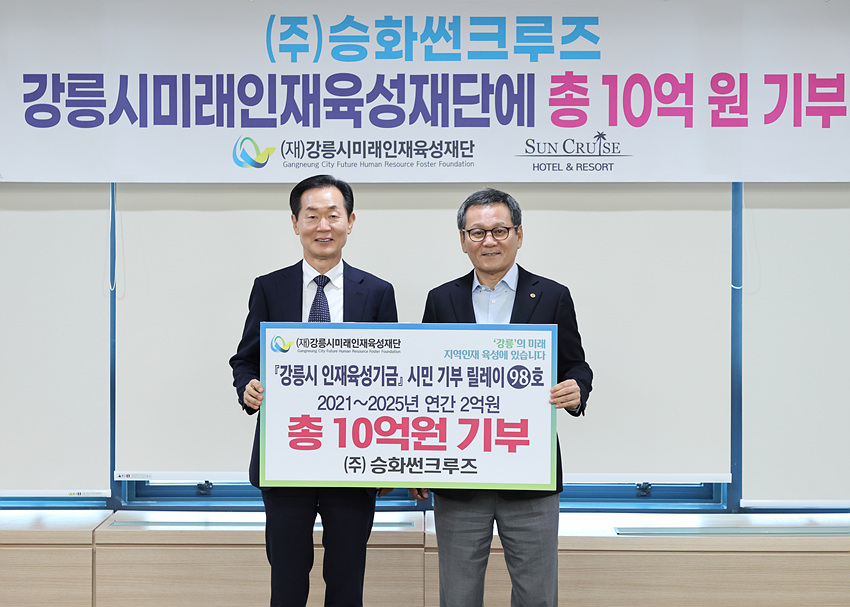 (강원=NSP통신) 조이호 기자 = 강원 강릉시(시장 김홍규)는 승화썬크루즈(대표 박기열)가 21일 강릉시미래인재육성재단(이사장 김상영)에 장학금 2억원을 기탁하며 5년간 총 10억원의 장학금을 전달했다.