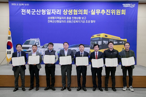 특히 이날 전라북도, 군산시, 참여기업 명신, 대창모터스, 코스텍, 양대노총, 고용노동부 군산지청은 ‘전북 군산형 일자리 공동근로복지기금 조성에 대한 업무협약’을 체결해 참여기업 간 복지 격차 해소와 노사 공동체 의식 고취 등에 힘을 모으기로 했다.