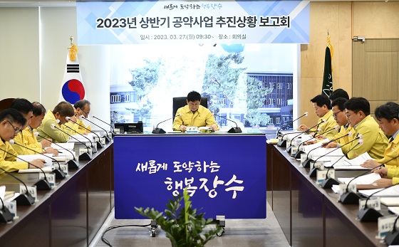 장수군은 27일 군청 회의실에서 공약사업 14개 소관 부서장이 참석한 가운데 2023년 상반기 민선8기 공약사업 추진상황 보고회를 개최했다.
