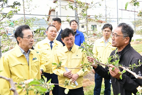 이날 현장점검은 4월 저온피해의 대부분이 사과와 같은 과수류에 집중돼 있고, 농가의 대다수가 농협 조합원인만큼 이성희 농협중앙회 회장이 직접 동행해 정확한 피해 규모와 상황을 파악하고 농가의 의견을 청취했다.