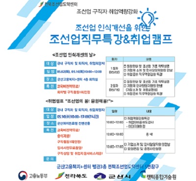 이번 직무특강은 조선업 인식개선을 목적으로 오는 2일과 16일 각 오전 10시부터 12시까지 군산고용복지플러스센터 4층 대강당에서 2회에 걸처 운영된다.